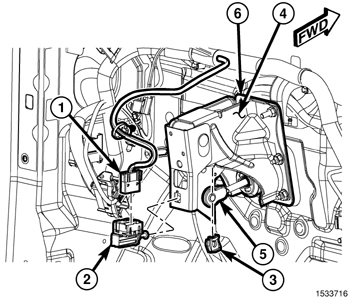 The stop lamp switch (2) is located under the instrument panel at the brake pedal arm. This switch contains three internal switches controlling various functions of the vehicle, one of them controls operation of the vehicle's brake lamps. Other functions of the internal switches include speed control deactivation and brake sense for the ABS and the brake transmission shift interlock.