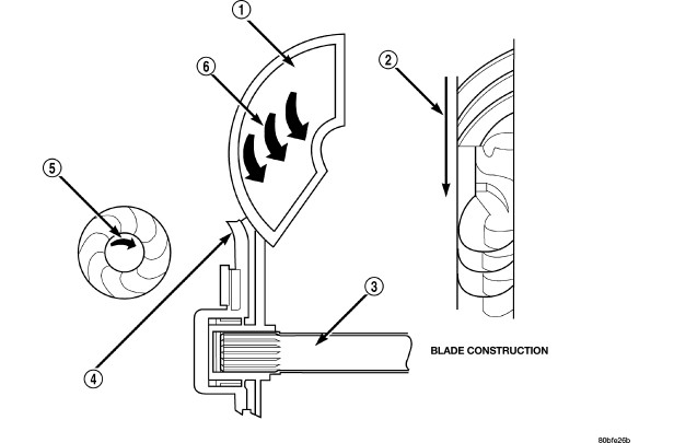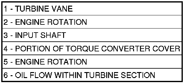 The torque converter is a hydraulic device that couples the engine crankshaft to the transmission. The torque converter consists of an outer shell with an internal turbine (1), a stator (4), an over-running clutch, an impeller (2) and an electronically applied converter clutch (5). The converter clutch provides reduced engine speed and greater fuel economy when engaged. Clutch engagement also provides reduced transmission fluid temperatures. The converter clutch engages in third gear. The torque converter hub (3) drives the transmission oil (fluid) pump.
