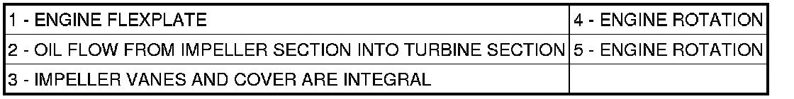 The impeller (3) is an integral part of the converter housing. The impeller consists of curved blades placed radially along the inside of the housing on the transmission side of the converter. As the converter housing is rotated by the engine (4,5), so is the impeller, because they are one and the same and are the driving member of the system.