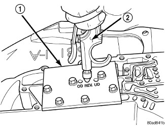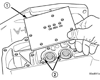 The clutches may be tested by applying air pressure (2) to their respective passages. The valve body must be removed and Air Pressure Test Plate 6056 (1) installed. To make air pressure tests, proceed as follows: