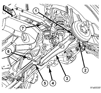6. Make a reference mark on the toe link cam (3), remove the toe link cam bolt and nut (1) attaching the toe link (2) to the rear suspension cross-member.