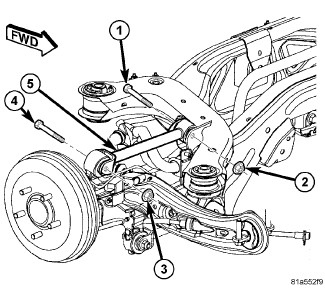 7. Loosen the Nut (3) at the knuckle and remove the bolt (4) attaching the upper control arm to the rear suspension cross-member.