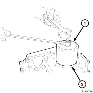 65. Using a hammer and suitable drift (2), drive out inner output bearing cup (1).