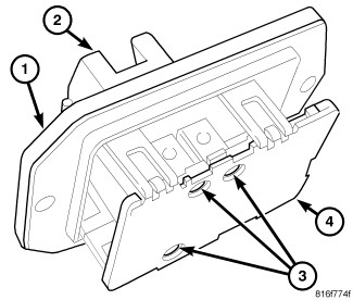 The blower motor resistor is mounted to the bottom of the HVAC housing, on the passenger side of the vehicle. The blower motor resistor consists of a molded plastic mounting plate (1) with an integral wire connector receptacle (2). Concealed behind the mounting plate are resistors (3) located between a two-piece stamped steel base (4). The blower motor resistor is accessed for service from under the instrument panel.