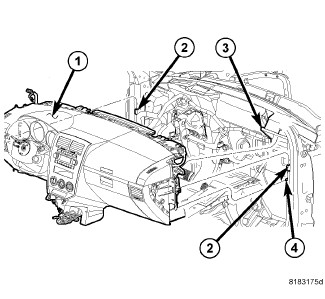 1. With the help of an assistant, load instrument panel into vehicle inserting stud (2) into dash and ensuring instrument panel hangs on reinforcement (2).