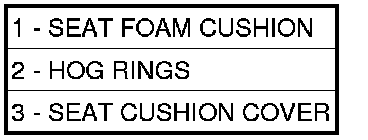 10. Separate the seat cover (3) from the foam cushion (1) and cut off all hog rings (2) attaching the cover to the foam.