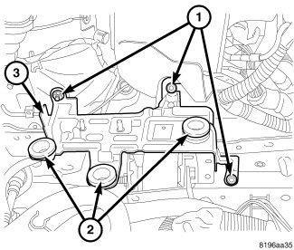 1. Make sure the rubber grommets (2), for the air cleaner housing lower pins, are in place when reinstalling the air cleaner housing. The rubber grommets mount to the PCM bracket (3).
