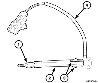 The evaporator temperature sensor measures the temperature of the conditioned air downstream of the A/C evaporator. The evaporator temperature sensor is an electrical thermistor (1) mounted on the end of a molded plastic housing (2) that is inserted into the driver side of the HVAC housing near the coldest point of the A/C evaporator. The evaporator temperature sensor is retained in the HVAC housing by two integral retaining tabs (3) and is connected to the vehicle electrical system by use of a wire lead and connector (4) with two terminals.