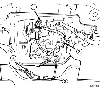 Remove liftgate lock motor (2) from liftgate by gently unsnapping.