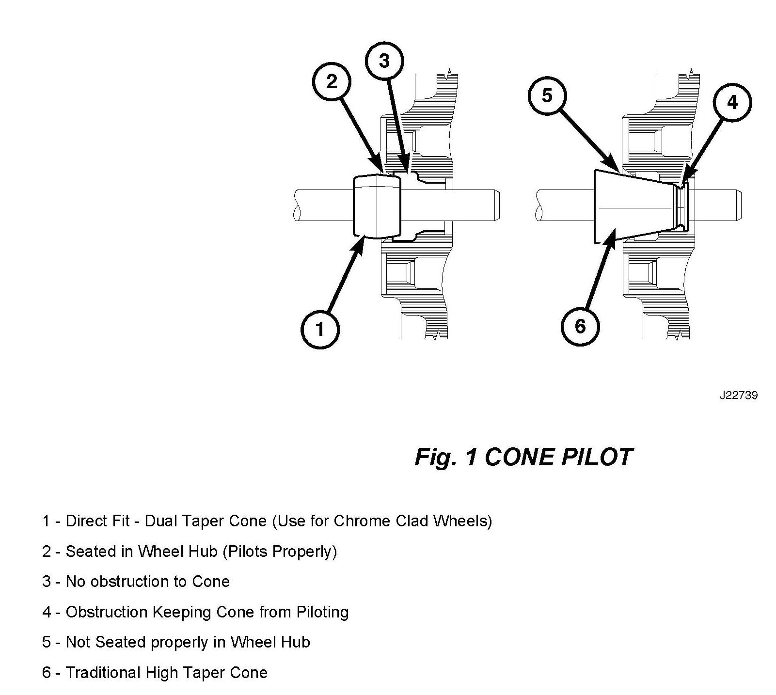 Models equipped with Chrome Clad wheels require specific piloting on balance equipment to properly center the wheel and prevent damage to the chrome clad surface. The chrome cladding is not removable or replaceable and has cladding tabs that extend into the wheel bore. Traditional high-taper cones will come into contact with the cladding tabs rather than properly seat on the hub bore chamfer. Many modern aluminum wheel designs cannot be mounted with traditional cones. Direct-Fit Collets should be used to properly mount clad wheels on balance equipment (Fig 1).