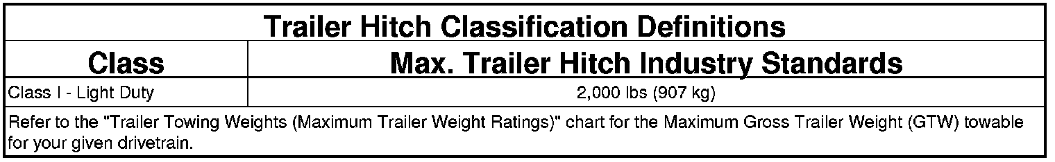 The following chart provides the industry standard for the maximum trailer weight a given trailer hitch class can tow and should be used to assist you in selecting the correct trailer hitch for your intended towing condition. Refer to the Trailer Towing Weights (Maximum Trailer Weight Ratings) chart for the Maximum GTW towable for your given drivetrain.