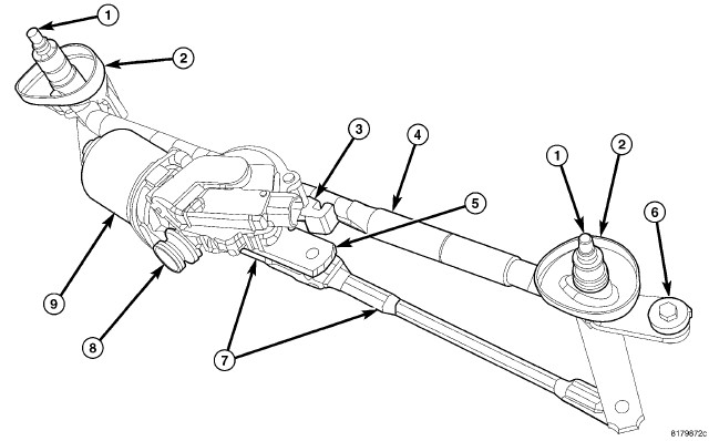- Linkage - Two stamped steel drive links (7) connect the wiper motor crank arm to the two wiper pivot lever arms. The passenger side link has a plastic socket-type bushing on each end, while the driver side link has a socket-type bushing on the pivot end and a sleeve-type bushing on the crank arm end. The bushing on the pivot end of each link is snap-fit over a ball stud on the pivot lever arm. The sleeve-type bushing on the driver side link is snap fit over the inner ball formation of a double ball stud on the crank arm, then the socket-type bushing of the passenger side drive link is snapped over the outer ball formation.