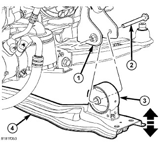 5. Remove the engine roll mount (3) through bolt (2) and remove the fore/aft crossmember (4).