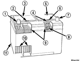 This battery is designed to provide a safe, efficient and reliable means of storing electrical energy in a chemical form. This means of energy storage allows the battery to produce the electrical energy required to operate the engine starting system, as well as to operate many of the other vehicle accessory systems for limited durations while the engine or charging system are not operating. The battery is made up of six individual cells that are connected in series. Each cell contains positively charged plate groups that are connected with lead straps to the positive terminal post, and negatively charged plate groups that are connected with lead straps to the negative terminal post. Each plate consists of a stiff mesh framework or grid coated with lead dioxide (positive plate) or sponge lead (negative plate). Insulators or plate separators made of a non-conductive material are inserted between the positive and negative plates to prevent them from contacting or shorting against one another. These dissimilar metal plates are submerged in a sulfuric acid and water solution called an electrolyte.