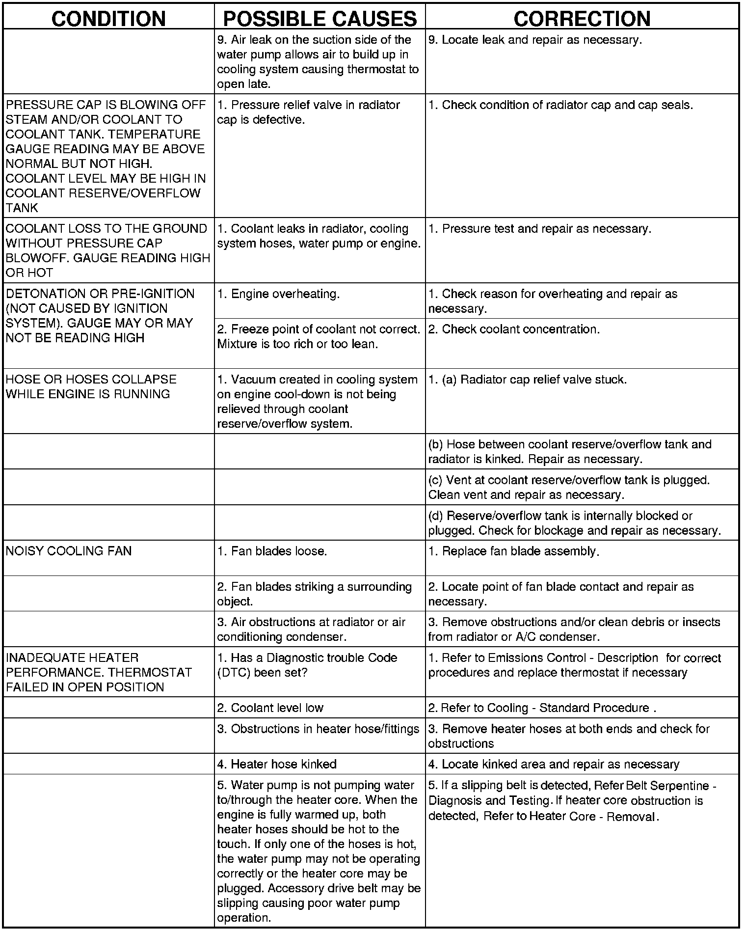 NOTE: If investigation reveals none of the previous items as a cause for an engine overheating complaint, refer to COOLING SYSTEM DIAGNOSIS CHART BELOW.
