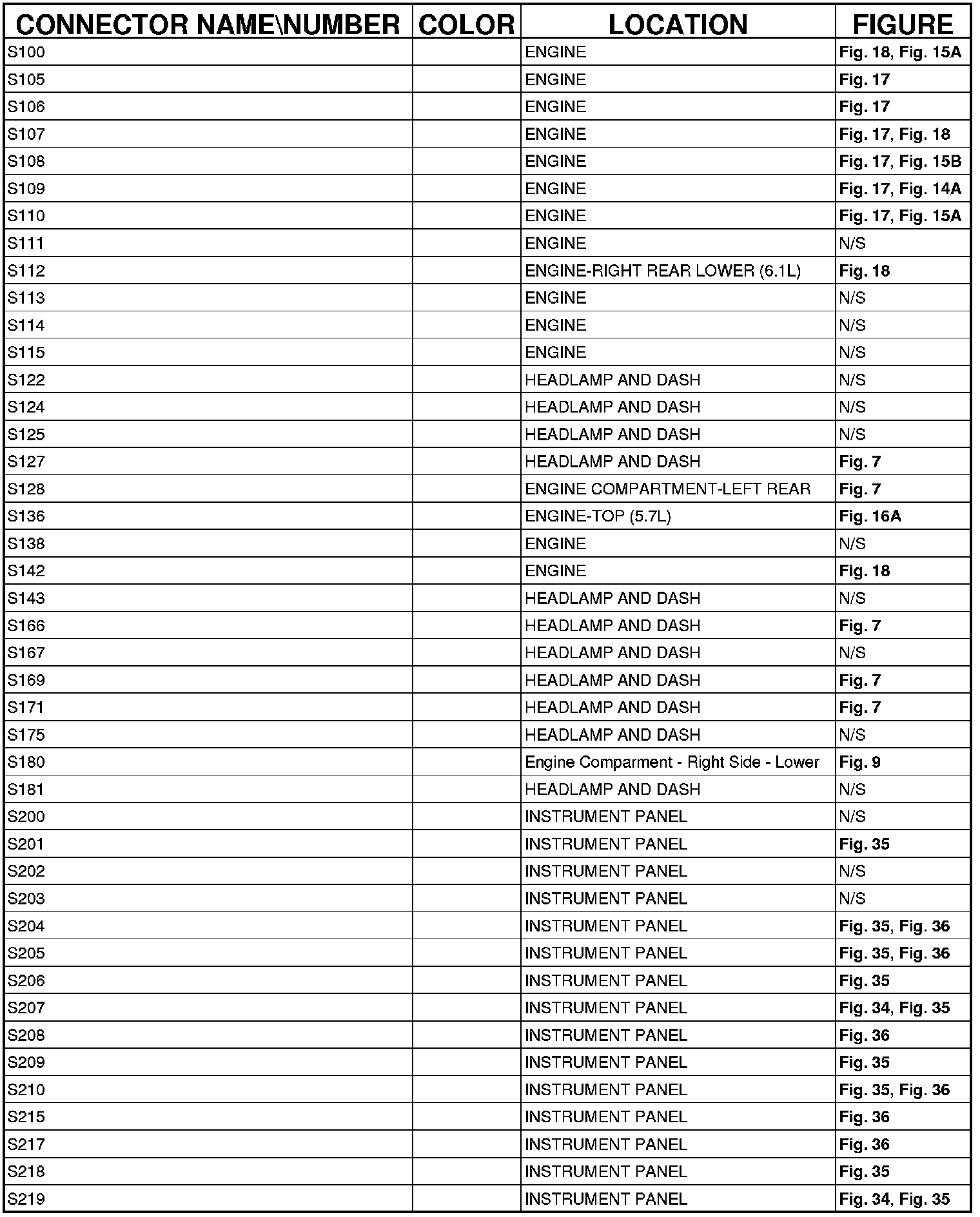 The abbreviation T/O (Take Out) is used in the location column to indicate a point in which the wiring harness branches out to a component.