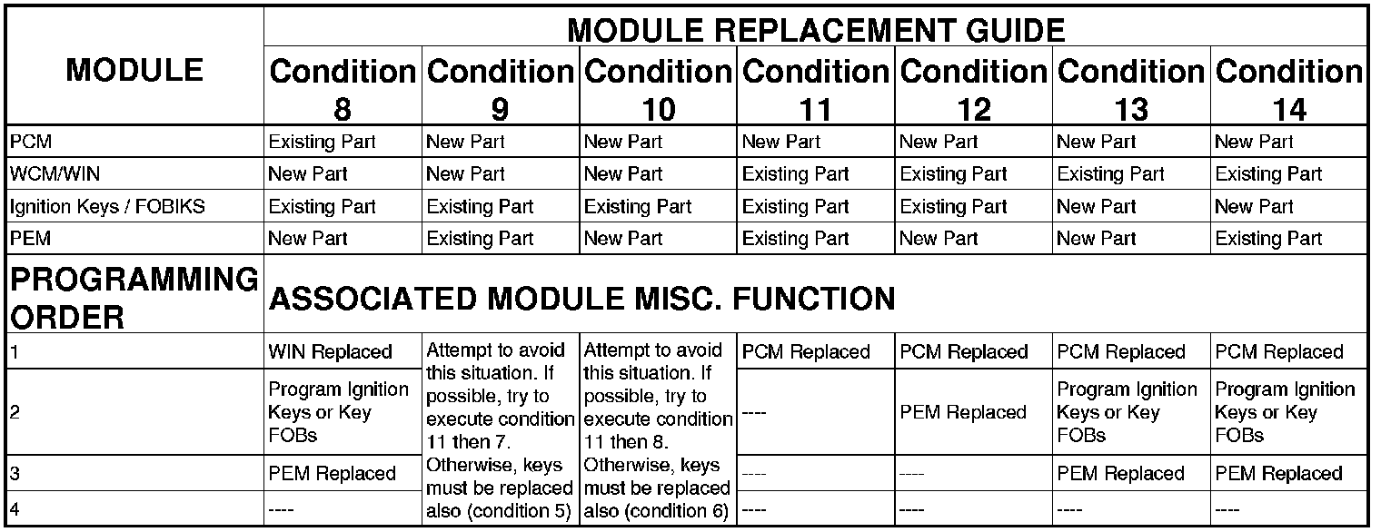 Match the module row with the condition that applies, after module replacement follow the chart down and program the modules in the chart order.