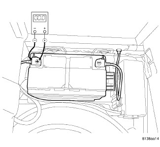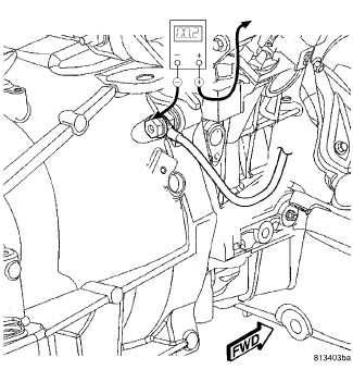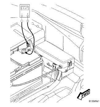 1. Remove the spare tire cover to gain access to the battery. Connect the positive lead of the voltmeter to the battery negative terminal post. Connect the negative lead of the voltmeter to the battery negative cable terminal clamp. Rotate and hold the ignition switch in the Start position. Observe the voltmeter. If voltage is detected, correct the poor connection between the battery negative cable terminal clamp and the battery negative terminal post.