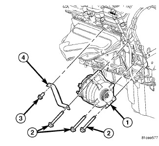 2. Position generator bracket (4) and loosely install bracket bolt (3) and upper generator mounting bolt (2).
