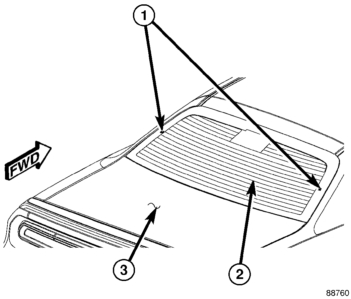 The rear window defogger system, also known as electric backlight (EBL), consists of two vertical bus bars (1) linked by a series of grid lines (2) fired onto the inside surface of the rear window (3).