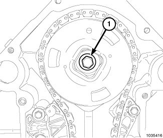 5. Install the camshaft phaser retaining bolt (1) finger tight.
