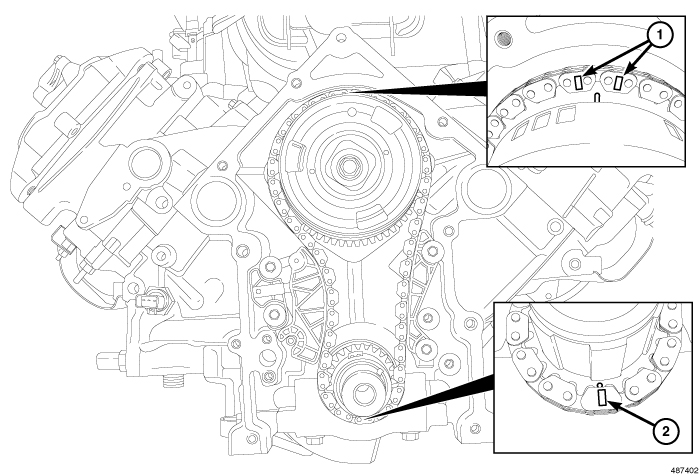 9. Rotate the crankshaft two revolutions and verify the alignment of the timing marks (1, 2). If the timing marks do not line up, remove the camshaft sprocket and realign.