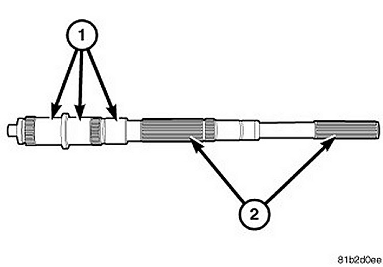 Mainshaft: Inspect bearing surfaces (1) for wear or flat-spots. Inspect splines (2) and snap ring grooves for wear. Inspect output seal surface for wear.