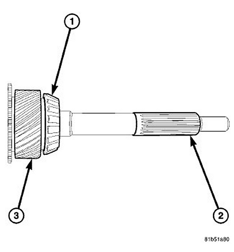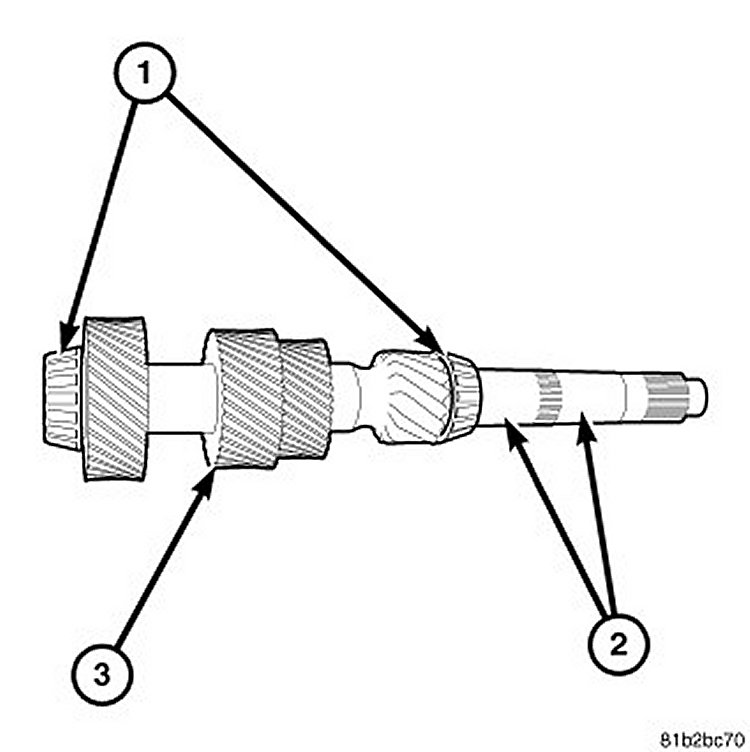 Countershaft: Inspect roller bearings (1) for wear, peeling, pitting or flat-spots. Inspect bearing surfaces (2) for wear or flat-spots. Inspect gear teeth (3) for worn, chips or cracks. Inspect splines and snap ring grooves for wear.