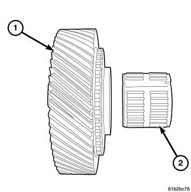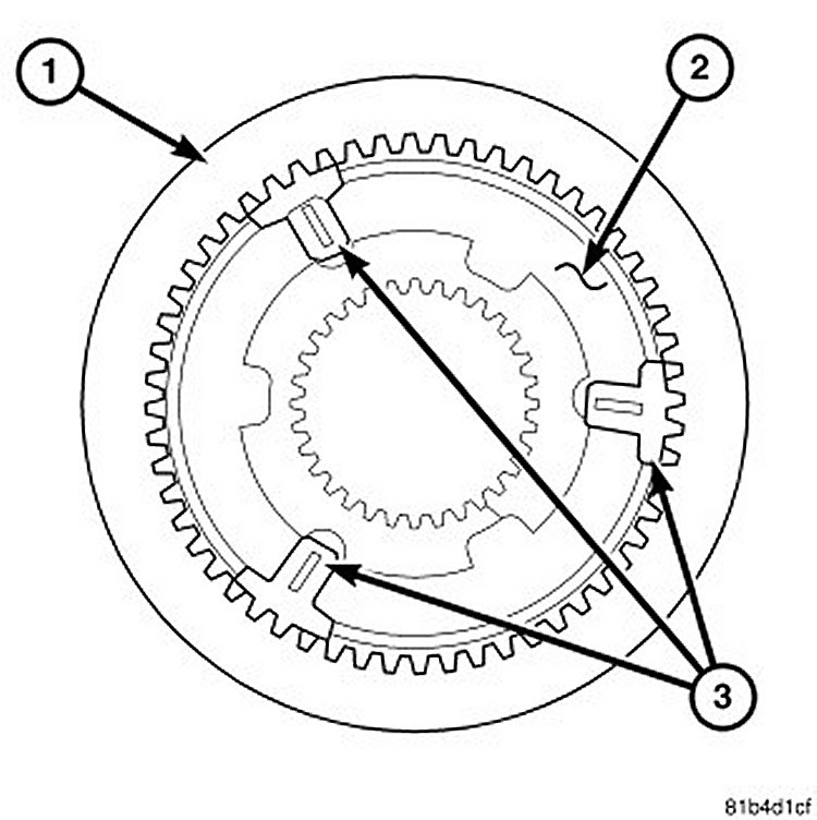 Inspect synchronizer sleeve (1) and hub (2) for worn teeth. Inspect synchronizer detents (3) for broken springs, missing balls or cracked/damaged housings.