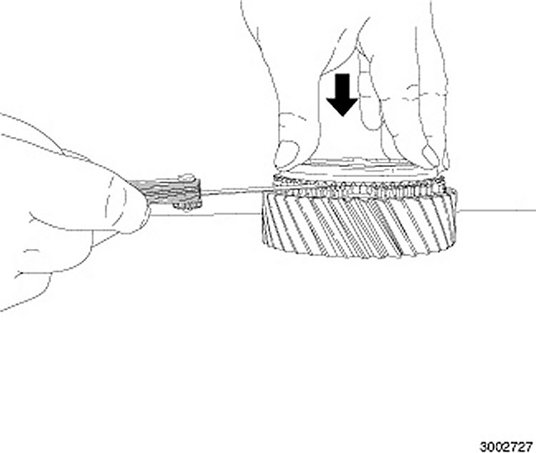 Synchronizer components: Inspect synchronizer rings (1) for worn, chips, or cracked teeth and burned or flaking friction material. Place blocker rings on gears. While applying pressure and rotating the blocker ring measure the clearance between the blocker ring and gear. If clearance is less than 0.75 mm (0.030 in.) replace blocker ring. Synchronizer rings (1) are serviced as an assembly.
