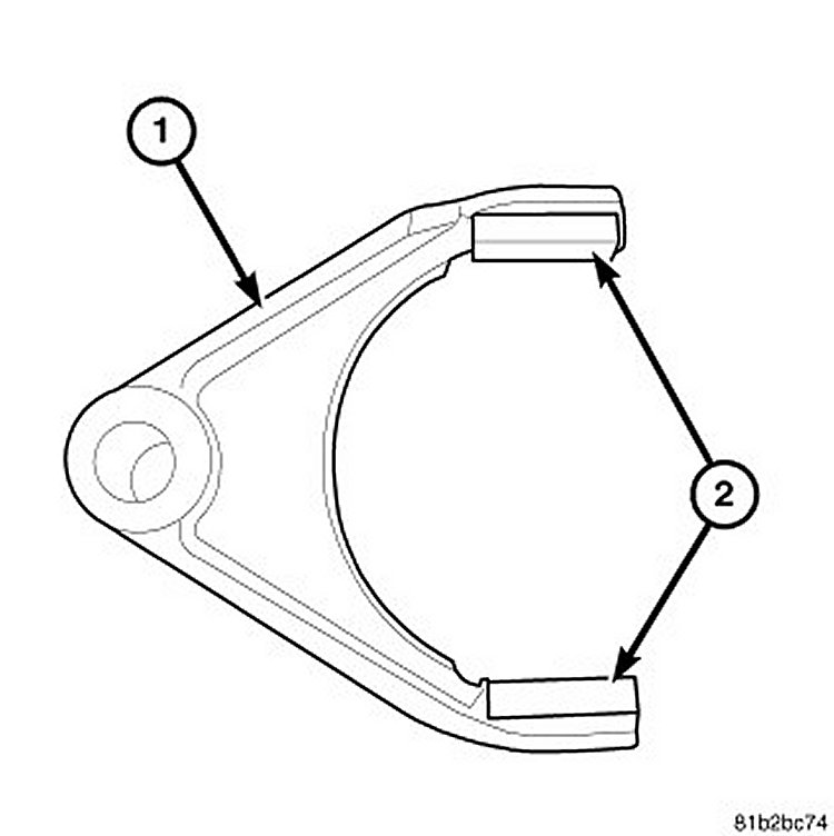 Shift Forks/Shift Rails: Inspect shift forks (1) for distortion. Inspect fork shoes (2) for wear or cracks. Fit shoes in synchronizer sleeve to ensure parts fit and work smoothly. Inspect shift rails for wear. Inspect shift rail bushings and bearings for wear.