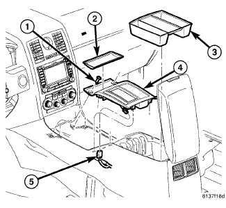 11. Position the mat (5) into the console rear bin with the curved edge oriented forward in the vehicle.