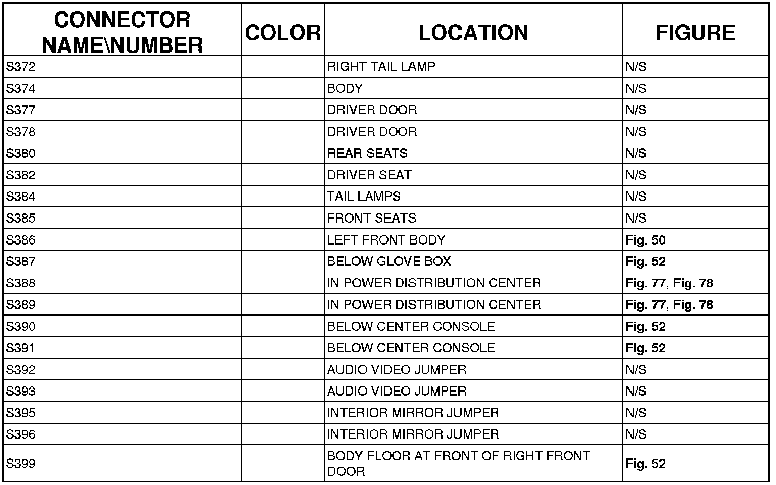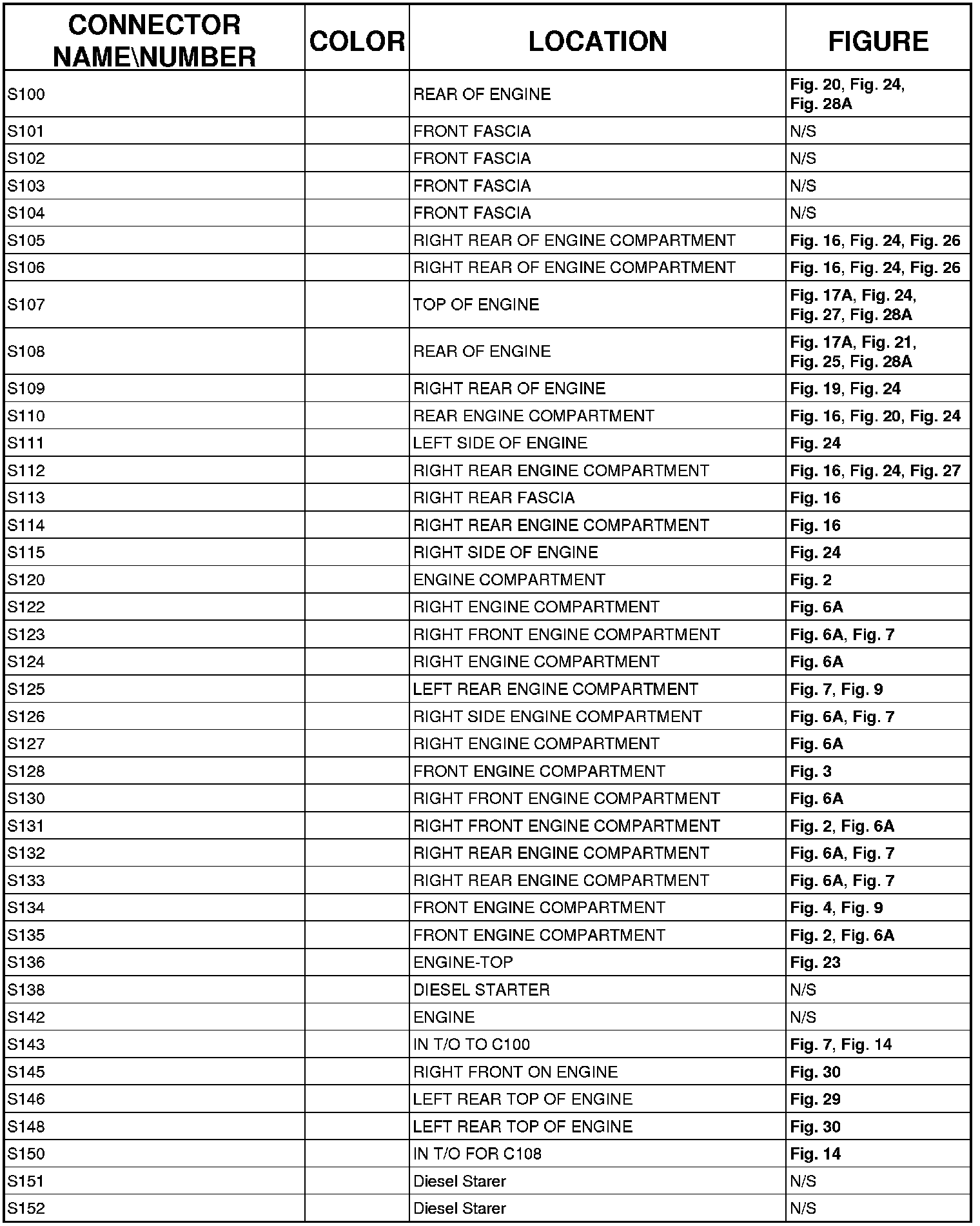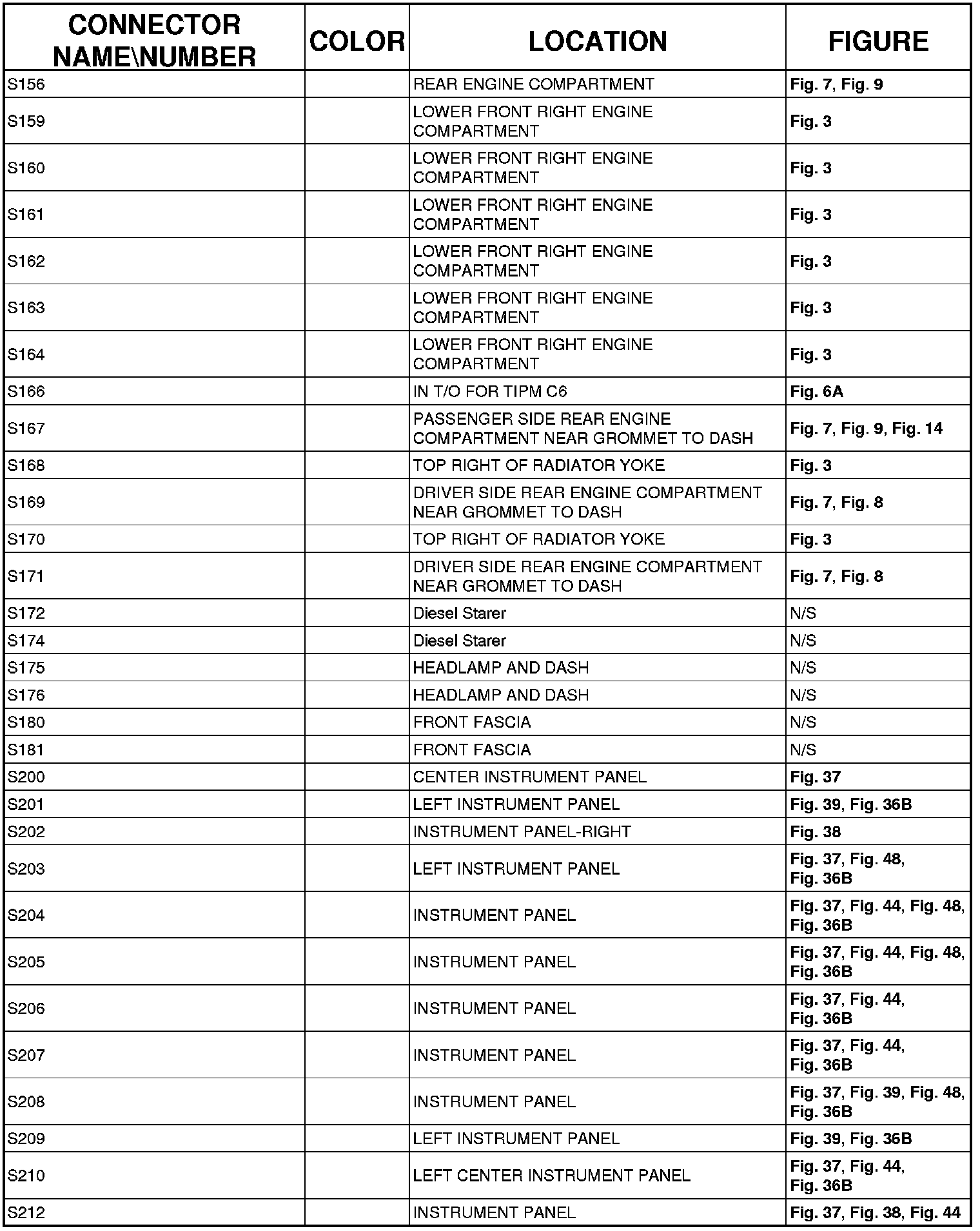 The abbreviation T/O (Take Out) is used in the location column to indicate a point in which the wiring harness branches out to a component.