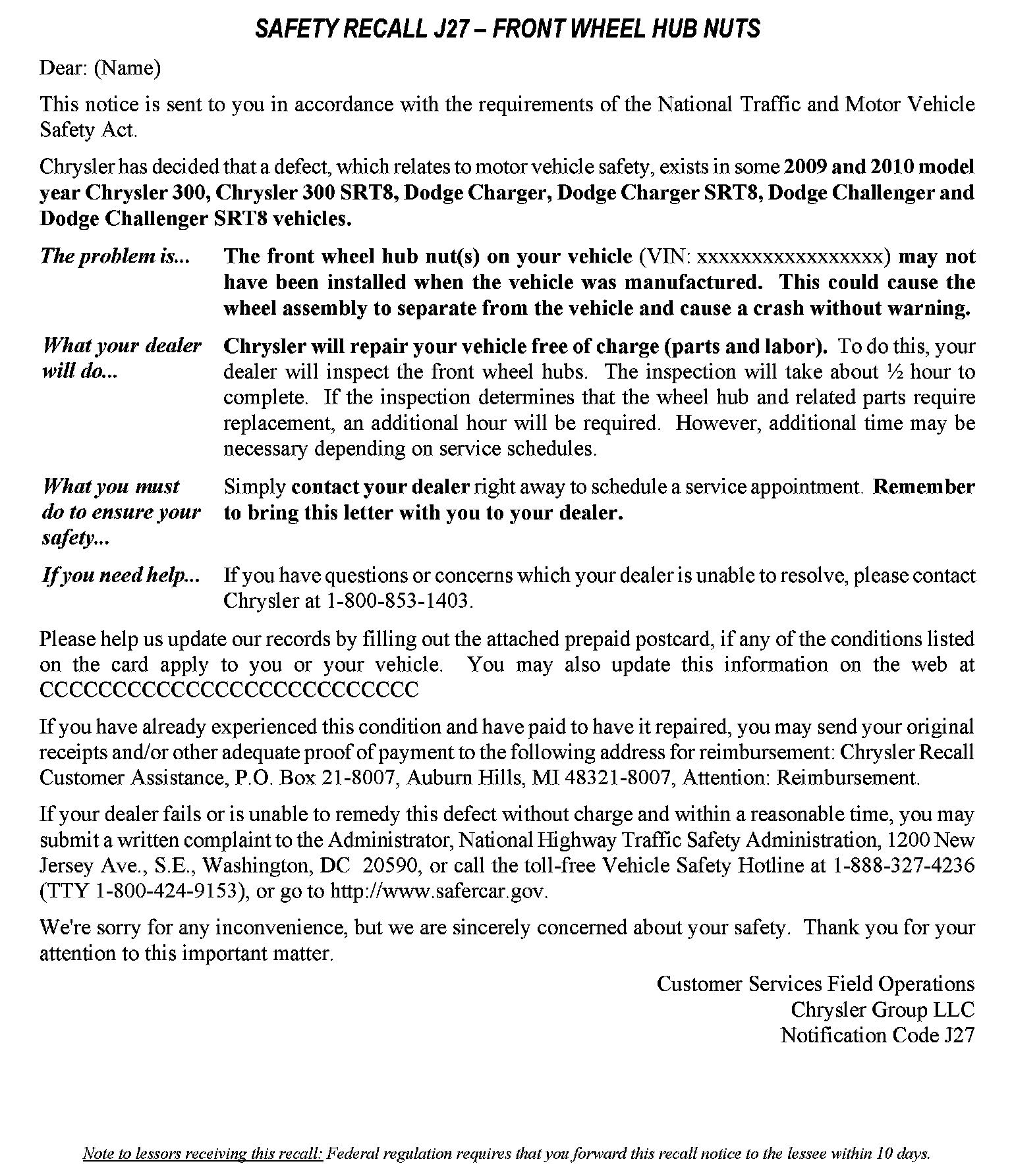Recall - Front Wheel Hub Nut Torque