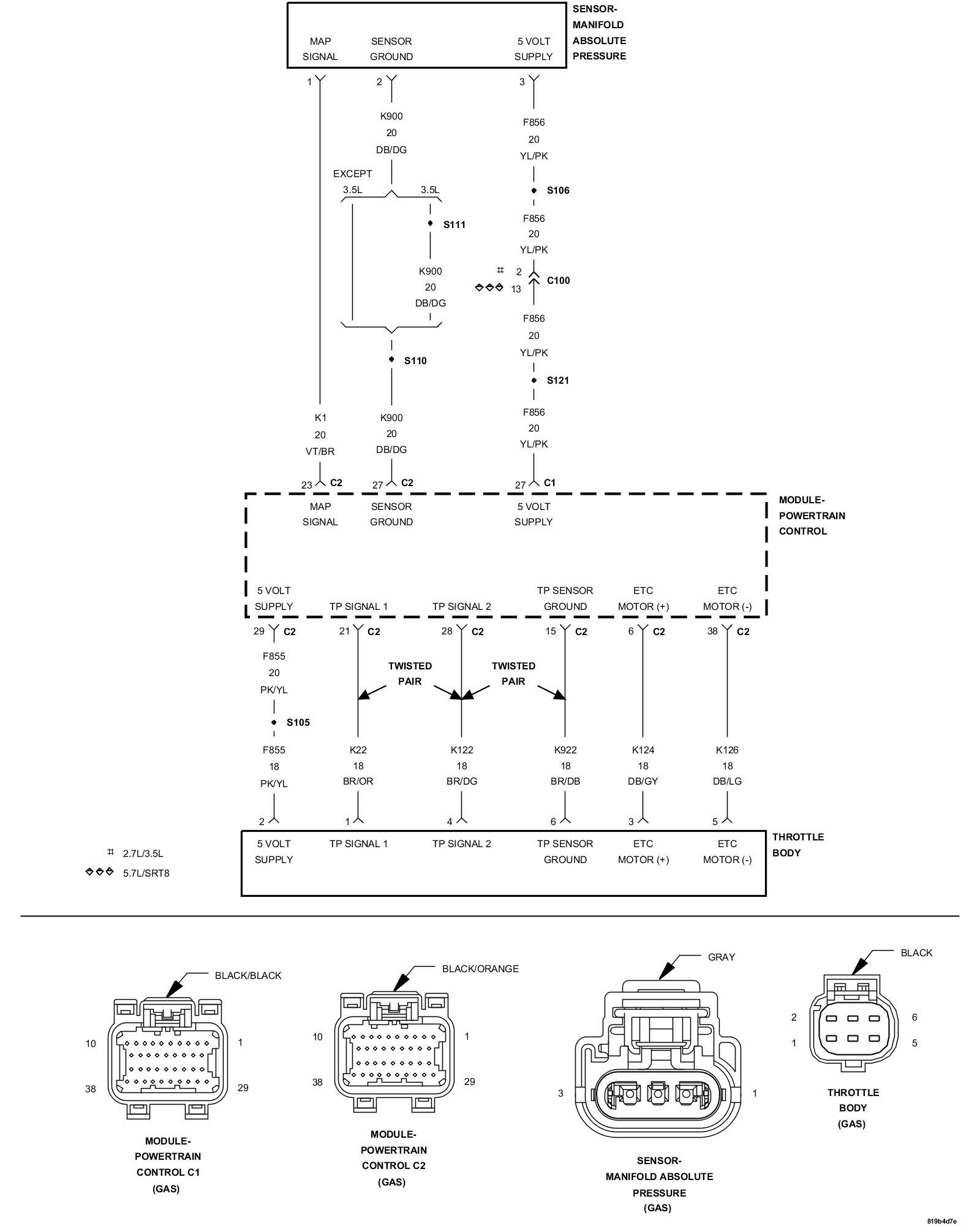 1. Using the wiring diagram/schematic as a guide, inspect the wiring and connectors between the MAP Sensor and the Powertrain Control Module (PCM).