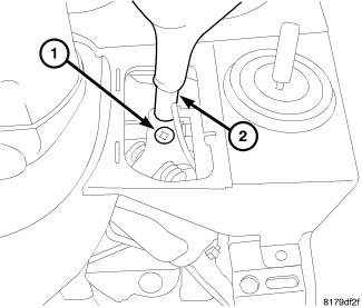 3. Raise the steering column assembly (2) into place and install the upper mounting bolts (1). Tighten the bolts (1) to 30 Nm (22 ft. lbs.).