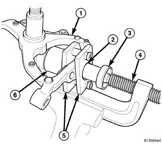 5. Position knuckle (1) over tools guiding top of ball joint inside of Receiver (6), then hand tighten Press screw-drive (4) until Remover (3) comes into contact with bottom of ball joint (2).