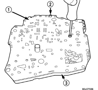 11. Invert valve body assembly and remove transfer plate-to-valve body screws (1).