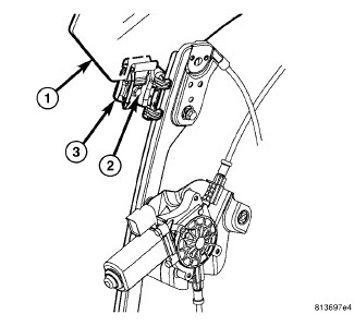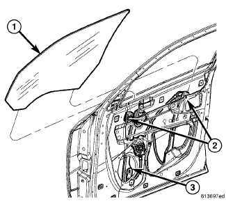 5. Using the regulator, adjust the front door glass (1) position up or down as required for access to the two window regulator glass clamps (3).