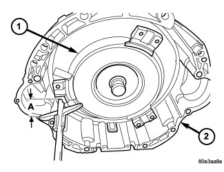 4. Place torque converter (1) in position in transmission (2).