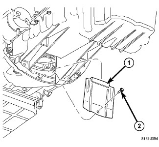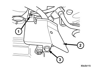 30. Position the heat shield (2), if equipped, onto the transmission housing and install the screw (1) and bolt (3) to hold the shield in place.