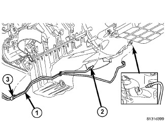31. Connect the cooler line fittings (2) and cooler lines (1) to the transmission.