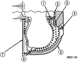 Fluid leakage at or around the torque converter area may originate from an engine oil leak (7). The area should be examined closely. Factory fill fluid is red and, therefore, can be distinguished from engine oil.