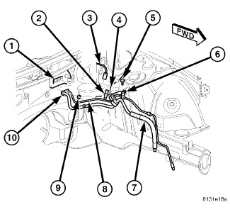 6. Disconnect the A/C suction line (7) and the A/C liquid line (8) from the A/C expansion valve and position the refrigerant lines out of the way.