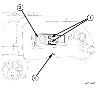 9. Remove the two bolts (1) that secure the A/C expansion valve (2) to the evaporator tube tapping block located within the foam seal (3).