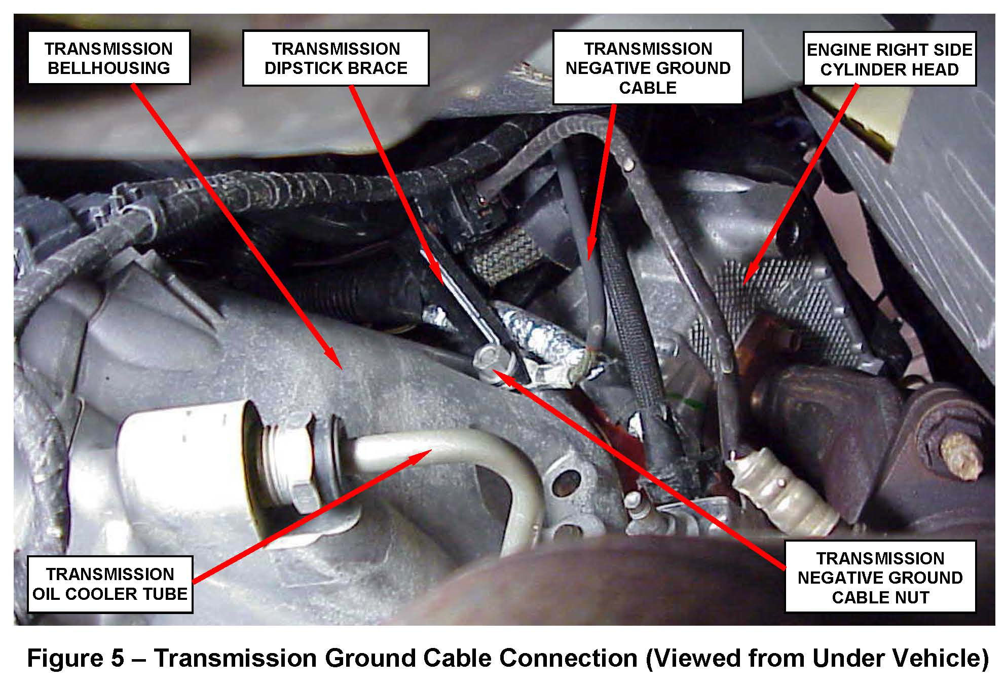 d. Remove and save the nut securing the transmission negative ground cable to the transmission bellhousing stud. (Figure 5).