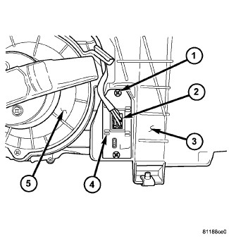 1. Position the blower motor resistor (4) into the HVAC housing (3).