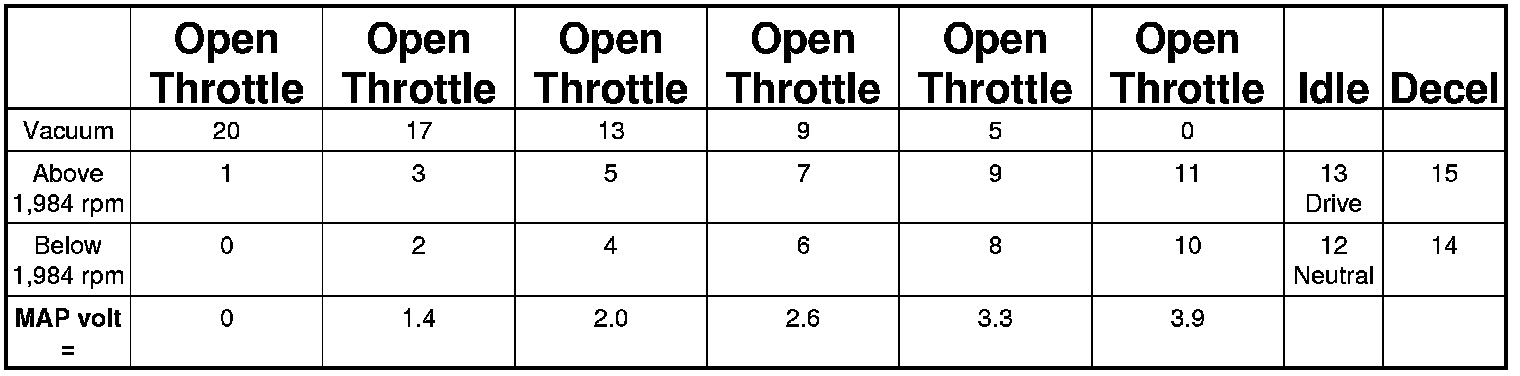 The number of cells varies upon the driving conditions. Two cells are used only during idle, based upon TPS and Park/Neutral switch inputs. There may be two other cells used for deceleration, based on TPS, engine rpm, and vehicle speed. The other twelve cells represent a manifold pressure and an rpm range. Six of the cells are high rpm and the other six are low rpm. Each of these cells is a specific MAP voltage range Typical Adaptive Memory Fuel Cells.