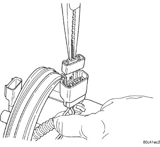 1. Push the fuel level sensor electrical terminal up into bottom of fuel pump/level sensor connector. Install the fuel level sensor signal and ground terminals to the connector.