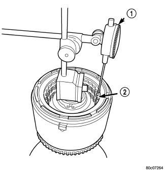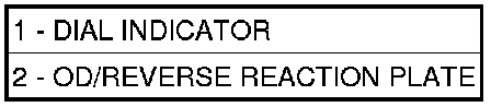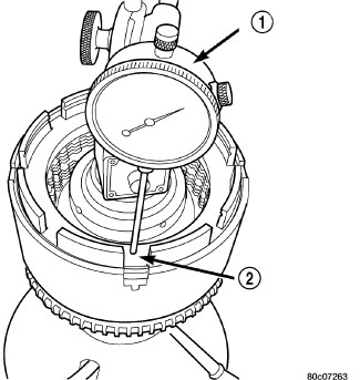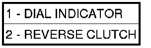 41. Using moderate pressure, press down and hold (near indicator) reverse clutch disc (2) with screwdriver or suitable tool and zero dial indicator (1). When releasing pressure, indicator should advance 0.005-0.010. as clutch pack relaxes.